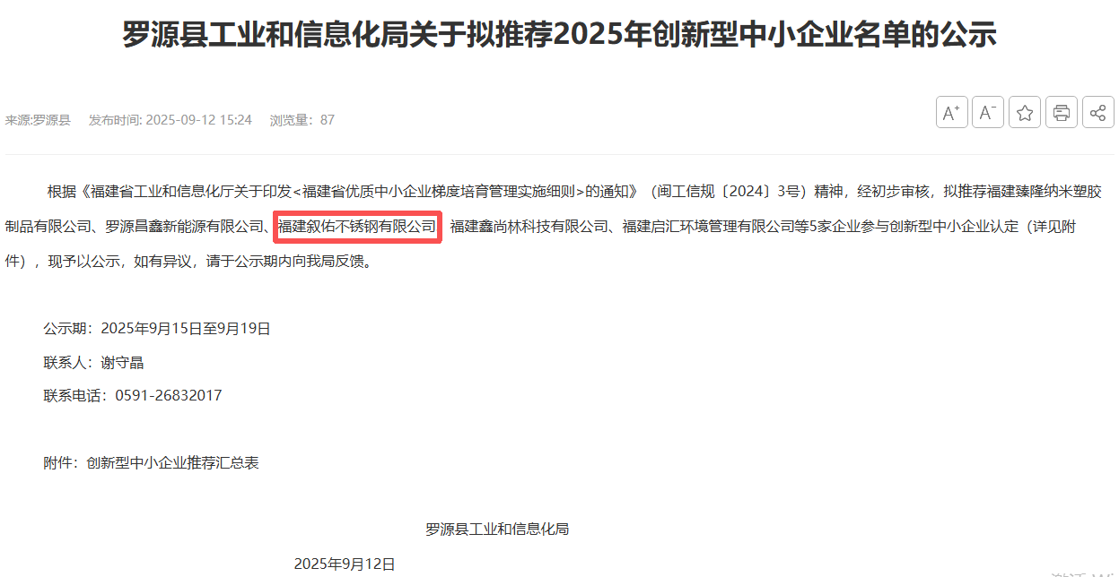 福建敘佑不銹鋼有限公司入選羅源縣2025年創新型中小企業名單
