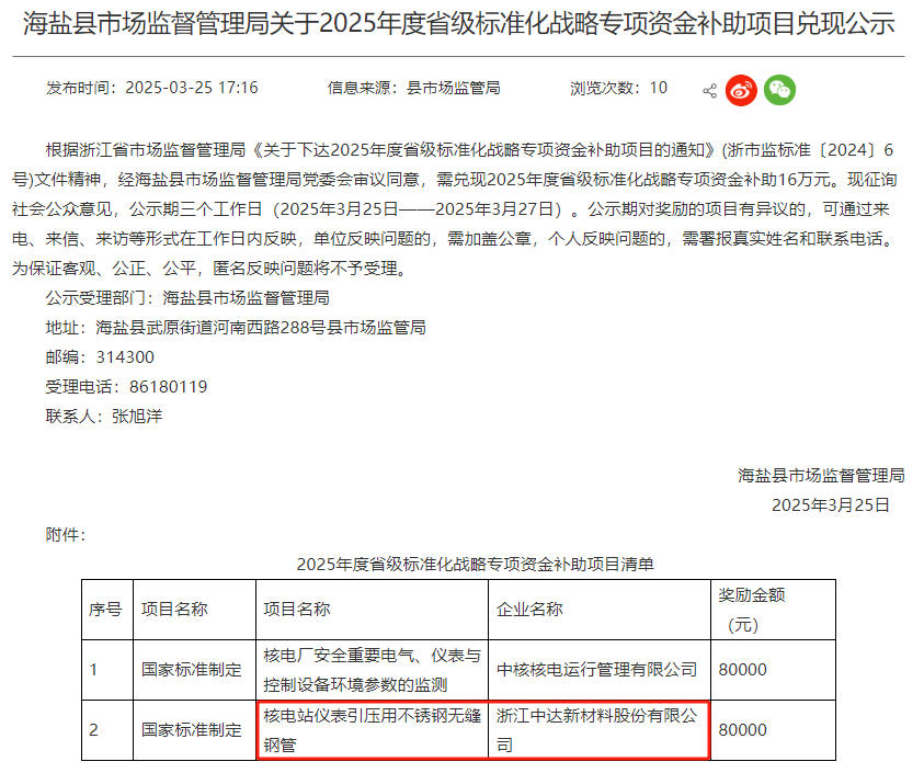 2025年3月25日,海鹽縣市場監督管理局就2025年度省級標準化戰略專項資金補助項目兌現進行公示。